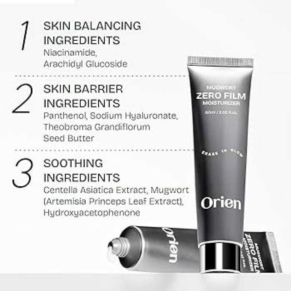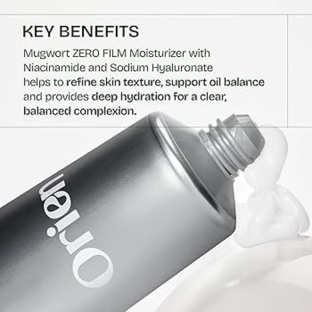 Orien Mugwort Zero Film Moisturizer is a Korean skincare product designed to hydrate and soothe skin, especially sensitive and acne-prone skin. It features a lightweight formula that doesn't leave a greasy or sticky layer on the skin.